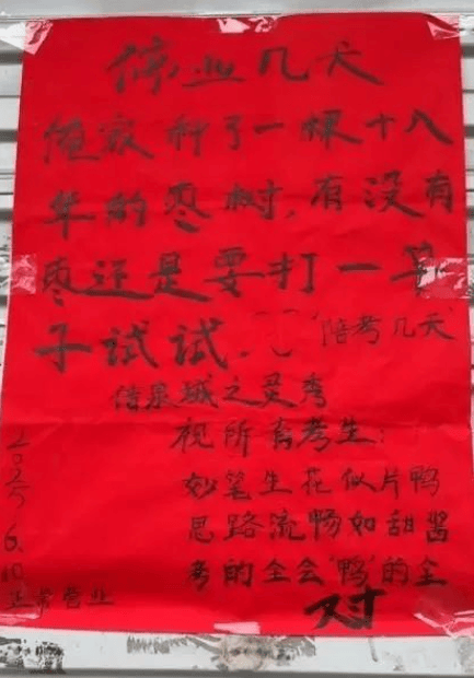 濟南一烤鴨店陪考停業告示火了,老板稱“種了18年的棗樹要打棗”