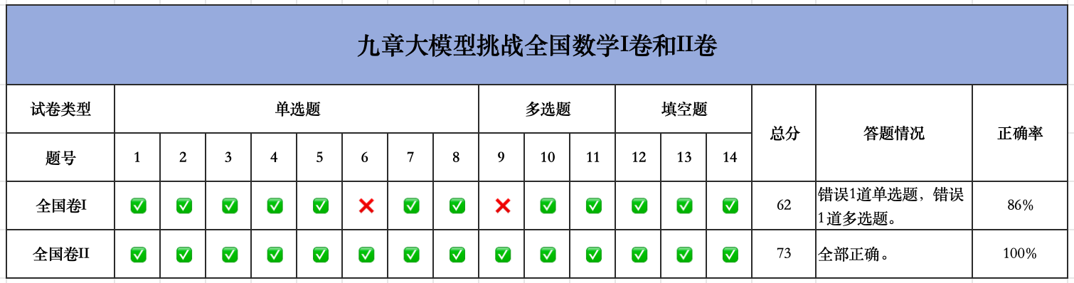 學而思旗下九章大模型針對2025年高考數學全國卷(Ⅰ卷、Ⅱ卷)的選擇題和填空題進行自測,結果顯示:在Ⅰ卷的14道選擇填空題中,九章大模型答對12道;在Ⅱ卷的14道選擇填空題中,全部正確。