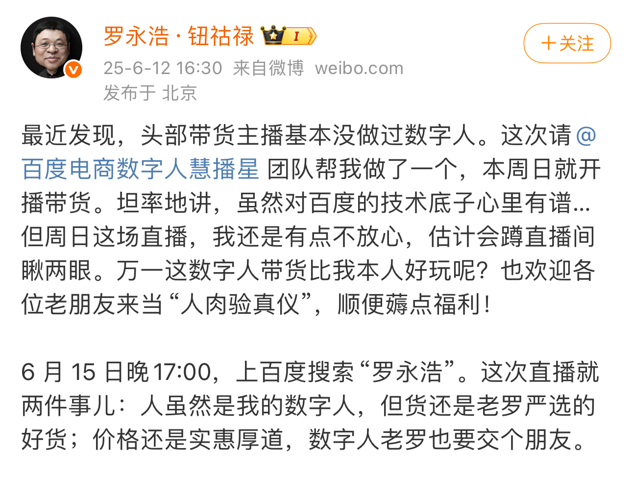 摘要: 6月13日消息,羅永浩于6月12日通過微博宣布,其數字人形象將于6月15日在百度電商平臺開啟直播帶貨,并歡迎老朋友們屆時前來充當人肉驗真儀,數字人老