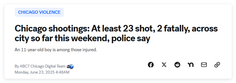 警方表示,在夏季的第一個周末,芝加哥發生了多起槍擊事件,導致至少23人中彈,其中兩人死亡。