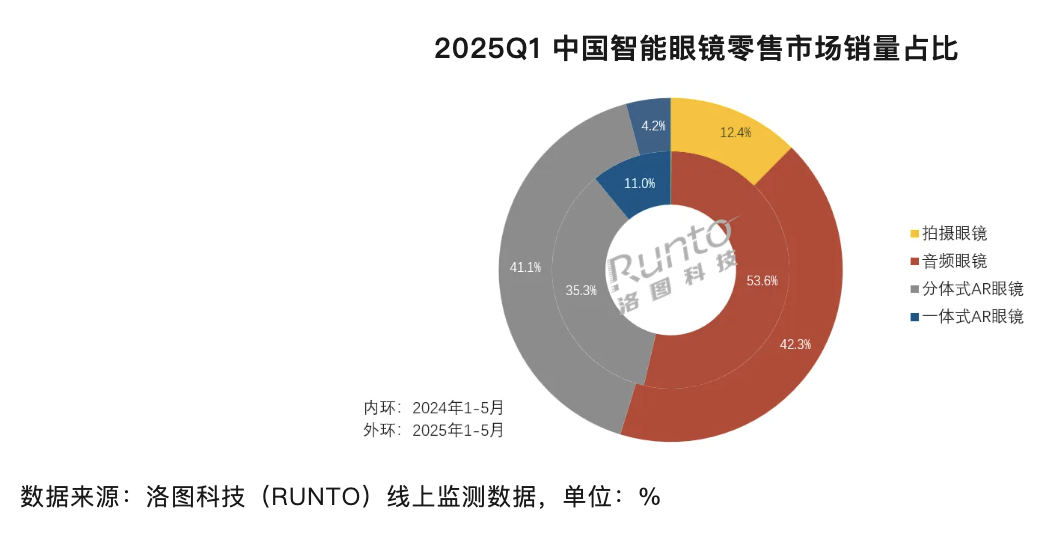 洛圖科技(RUNTO)將智能眼鏡按功能分為:音頻眼鏡、拍攝眼鏡、分體式AR眼鏡和一體式AR眼鏡四類。根據洛圖科技(RUNTO)數據顯示,在2025年1月到5月,這四類細分產品在中國線上零售市場的占比分別為42.3%、12.4%、41.1%和4.2%。