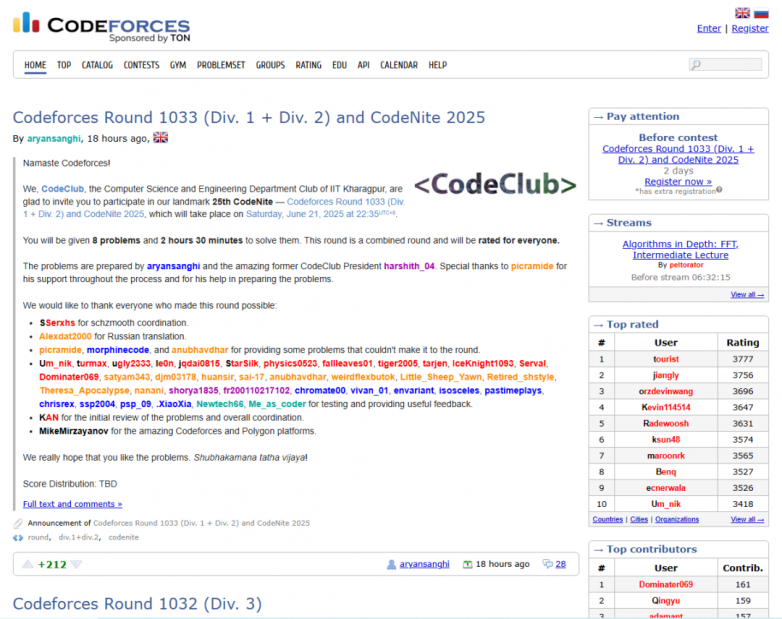 特點:題目風格多樣,課余時間充盈的選手可作為AtCoder和Topcoder的下位使用;舉辦比賽,但時間通常在中國北京時間的半夜(網站僅支持英語和俄語,選手可以借助瀏覽器機翻理解)。Codeforces下的一個欄目“Gym”,存有各地ACM競賽題目,建議高段選手用來訓練。