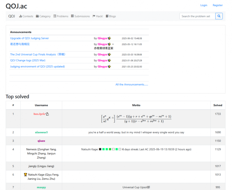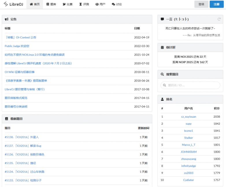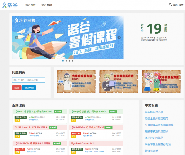 特點:題目全面,且均有詳細題解,供選手查看測試數據和運行結果,便于調試、改錯;題目按照知識點章節遞進排序,由易到難,不能跳題,便于選手體系化訓練編程知識。每年12月至次年3月會舉辦比賽,題目質量高、重思維,是個很好的鍛煉機會。