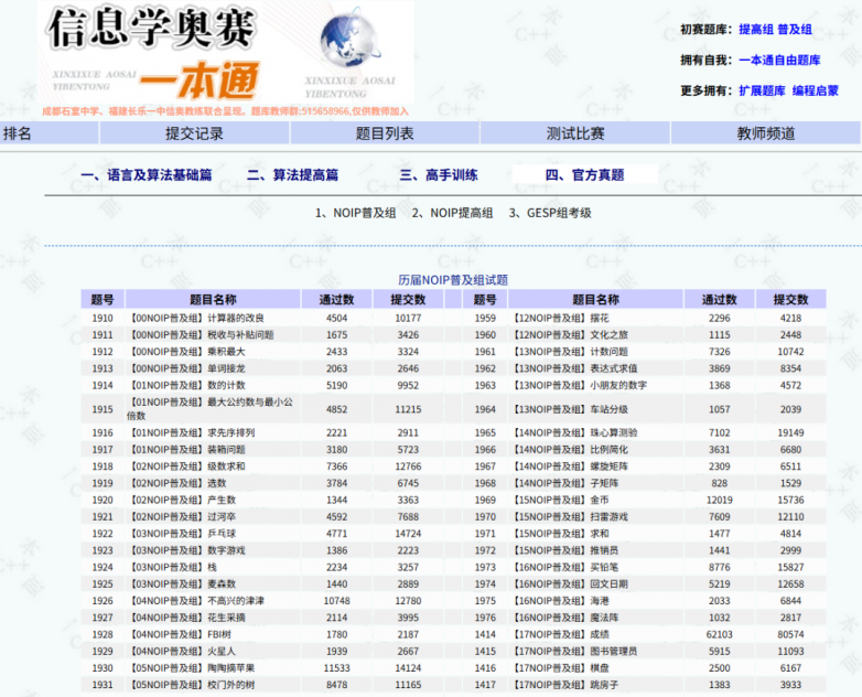 特點:可按照不同比賽、題目難度等級、算法專題進行分類,是信奧選手的主要訓練平臺。題目數量多,需要選手根據自身情況進行選擇性訓練。