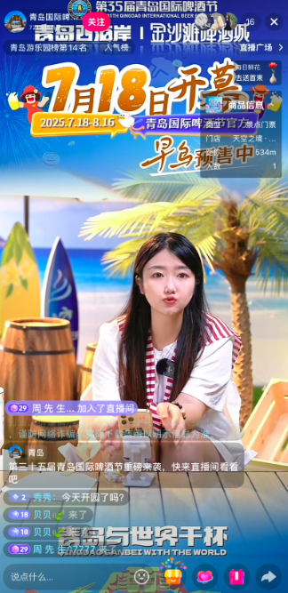 據悉,雙方共同開通“青島國際啤酒節·金沙灘啤酒城”抖音直播間,將通過城內城外聯動,上架優惠代金券、文旅套餐等產品(涵蓋中心舞臺主題演出、夢幻島主題樂園、“天空之境”高空水滑梯、“海上有青島”全景秀等),圍繞青島國際啤酒節提供深度文化解讀與導覽,同時提供啤酒節產品及衍生產品。