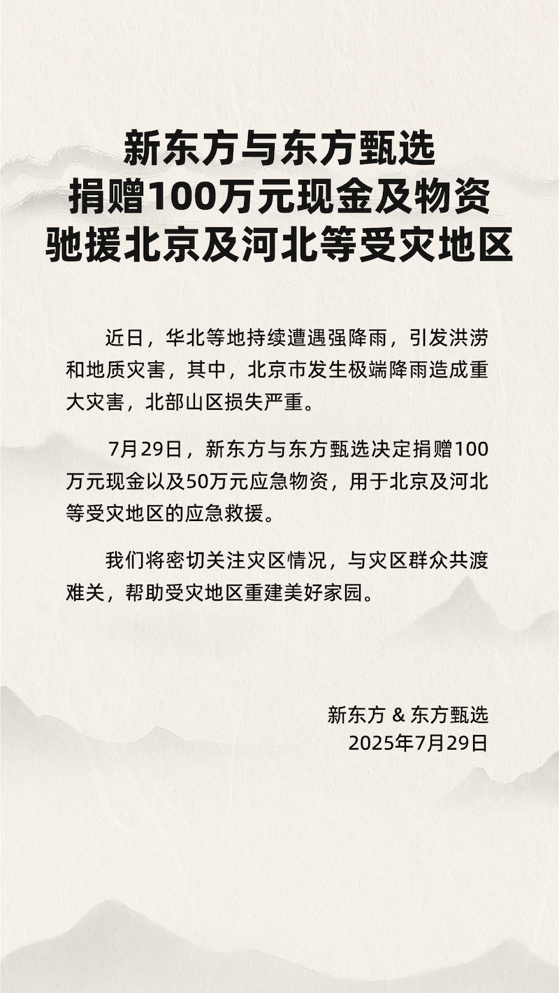 新東方與東方甄選捐贈100萬元現金及物資馳援北京及河北等受災地區