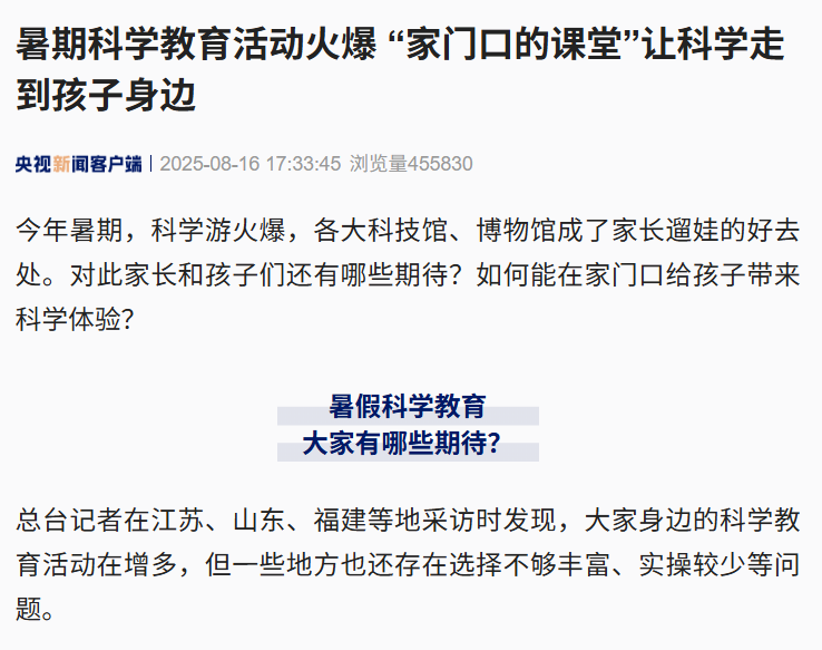 摘要: 8月16日,央視報道暑期科學教育的火爆圖景,各大科技館和博物館成為孩子們暑期新去處。在這股科學熱潮中,東陽市融媒體中心正帶來一場和奇趣科學聯