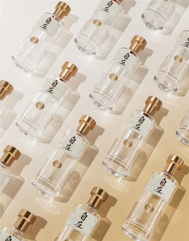 其三,包裝超預(yù)期。舍得自在的高透水紋瓶身設(shè)計摒棄繁復(fù),以通透質(zhì)感契合“輕盈”特質(zhì),立體水紋呼應(yīng)“水利萬物”的東方智慧,兼具新中式東方韻味與極簡現(xiàn)代風(fēng)格;同時醒目的29度金色標(biāo)識、“自在”二字的墨跡飛白,傳達(dá)“低酒度無壓力”產(chǎn)品特性,降低消費者對飲用白酒的心理門檻。