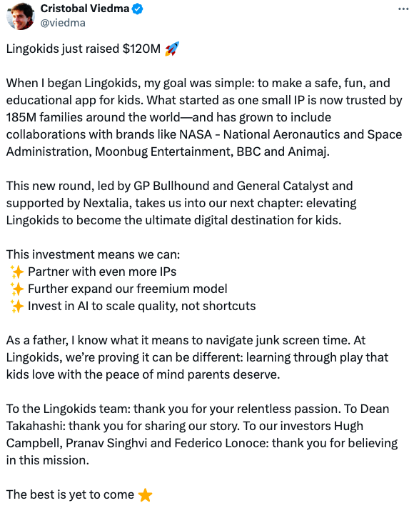 Lingokids創(chuàng)始人兼首席執(zhí)行官Cristobal Viedma表示:“當(dāng)我創(chuàng)辦 Lingokids 時(shí),我的目標(biāo)很簡(jiǎn)單:為孩子們制作一款安全、有趣且具有教育意義的應(yīng)用程序。最初只是一個(gè)小 IP,現(xiàn)在已受到全球1.85 億個(gè)家庭的信賴(lài),并且已經(jīng)發(fā)展到與 NASA(美國(guó)國(guó)家航空航天局)、Moonbug Entertainment等品牌合作。”