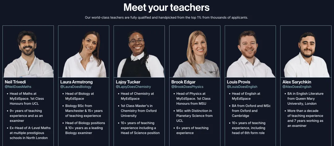 教師均經(jīng)過(guò)嚴(yán)格的選拔,均來(lái)自英國(guó)頂尖的1%,都是獲得 A-Level 最高成績(jī)并就讀于劍橋大學(xué)、帝國(guó)理工學(xué)院等英國(guó)頂尖大學(xué)的學(xué)生。他們同時(shí)為數(shù)千名學(xué)生提供現(xiàn)場(chǎng)授課,并已在社交媒體上擁有超過(guò)400萬(wàn)的粉絲,以學(xué)生熟悉的形式講解復(fù)雜的主題。