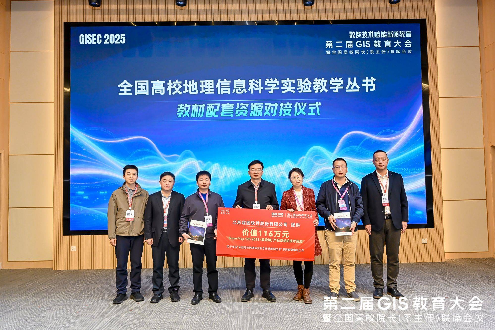大會舉行了“全國高校地理信息科學實驗教學叢書”教材編委聘任暨配套資源對接儀式。超圖軟件將提供“SuperMap GIS 2025”教育版軟件產品及相關技術資源用于支持“全國高校地理信息科學實驗教學叢書”系列教材編寫工作。會上,超圖軟件副總裁兼華中、華南大區總裁孫鵬,超圖軟件總工程師兼平臺產品線總裁胡中南代表超圖軟件,向教材編委會主任中國地理信息產業協會教育工委會主任委員、南京師范大學張書亮教授,教材主編南京師范大學熊禮陽教授,華中師范大學吳浩教授,陜西師范大學李晶教授,云南師范大學洪亮教授提供軟件產品。