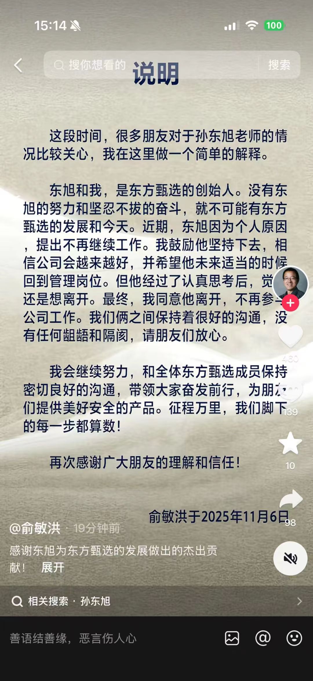 俞敏洪在說明中提到,“東旭和我,是東方甄選的創始人。沒有東旭的努力和堅忍不拔的奮斗,就不可能有東方甄選的發展和今天。近期,東旭因為個人原因提出不再繼續工作。我鼓勵他堅持下去,相信公司會越來越好,并希望他未來適當的時候回到管理崗位。但他經過了認真思考后,覺得還是想離開。最終,我同意他離開,不再參與公司工作。我們倆之間保持著很好的溝通,沒有任何齟齬和隔閡,請朋友們放心。”
