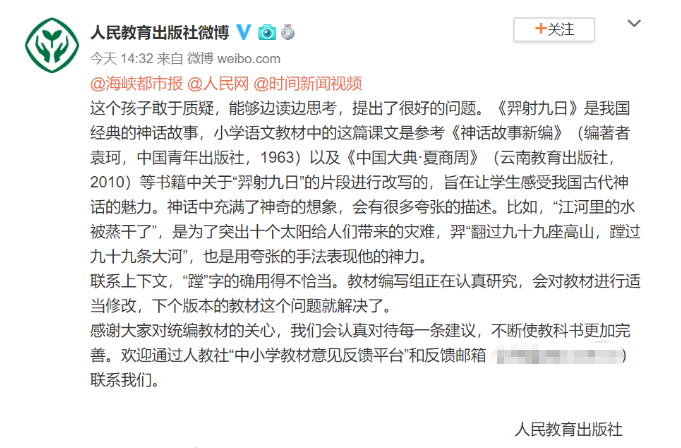 6月14日下午,就福州小學生質疑課文《羿射九日》表述不恰當一事,人民教育出版社在官方微博發表回應 。