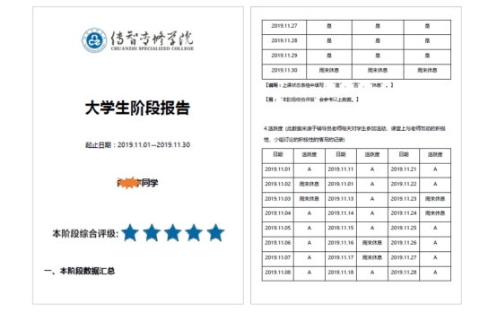 不僅如此,跟一般的大學不同,傳智專修學院每個月都會整理每位學生的在校狀況報告反饋給學生家長,報告中包括學生的出勤、學習情況及身體、生活狀態,讓學生對自己的學習情況有監督,也讓學生家長對學生的在校情況放心。